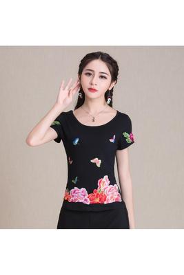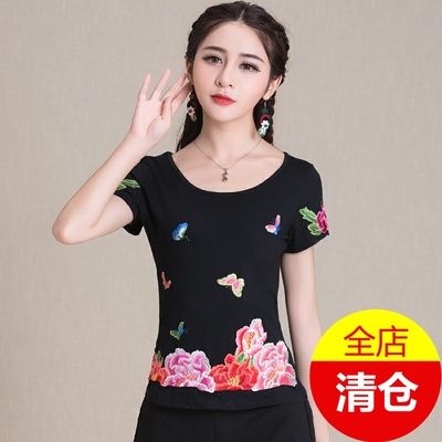 Kiểu dáng quốc gia nữ có kích thước lớn thêu áo thun ngắn tay kiểu Trung Quốc mùa hè đầm mỏng chạm đáy nửa tay thêu cotton - Áo phông áo phông nữ tay lỡ Áo phông
