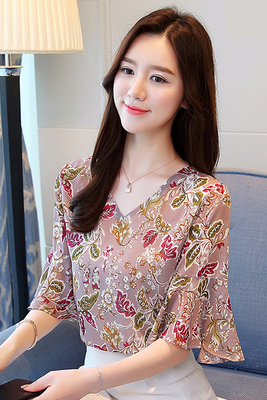 Lỏng t-shirt nữ ngắn tay V-Cổ hoa áo sơ mi nhỏ mùa hè ăn mặc chất béo mm bìa bụng tuổi nửa tay áo kích thước lớn voan quần áo phụ nữ măng tô nữ