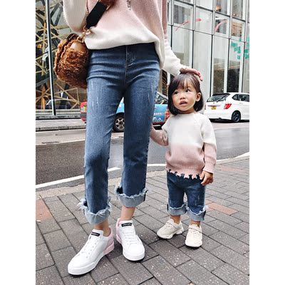 LUSON cha mẹ-con mặc quần jean mùa thu gia đình mới của ba quần jeans bà bầu quần giản dị cha-con áo cặp gia đình Trang phục dành cho cha mẹ và con