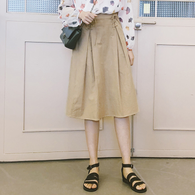 Mận nấu chín văn học cao eo Một từ váy retro chic Hồng Kông hương vị kaki váy nữ 2018 đầu mùa thu mới chân váy chữ a ngắn