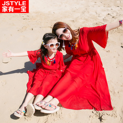 Mẹ và con gái mùa hè tay áo kèn tay áo đỏ phóng túng bãi biển giảm béo kỳ nghỉ bãi biển ăn mặc cha mẹ con béo mẹ thủy triều - Trang phục dành cho cha mẹ và con quần áo cá tính cho mẹ và bé Trang phục dành cho cha mẹ và con