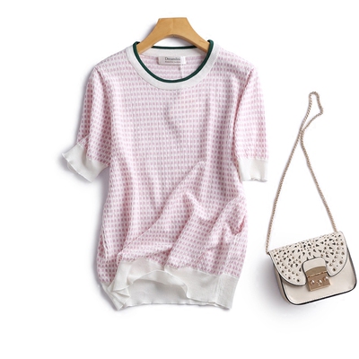 Mềm 糯 不 不 ~ thanh lịch nhỏ thơm tính khí tương phản màu vuông kẻ sọc ngắn tay áo len mỏng cổ tròn mỏng t áo sơ mi áo len dáng dài Áo / áo thun