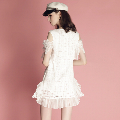 MIUCO2018 mùa hè nặng làm việc rỗng thêu khâu ren đính cườm vòng cổ quây bất thường ăn mặc váy nhung xếp ly eo