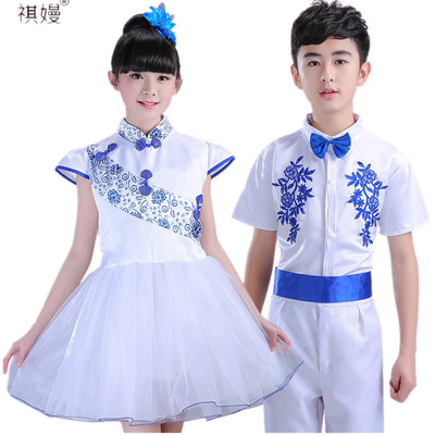 Mới đọc trang phục trẻ em màu xanh và trắng sứ tiểu học và trung học sinh viên điệp khúc quần áo trẻ em trai và cô gái nhảy guzheng hiệu suất đồ bộ cho be gái 12 tuổi