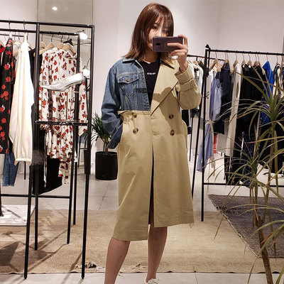 MOMO FAN2018 mùa thu denim khâu áo gió nữ dài coat dài tay áo áo MA183TRC109 áo phao nữ dáng dài hàn quốc Trench Coat