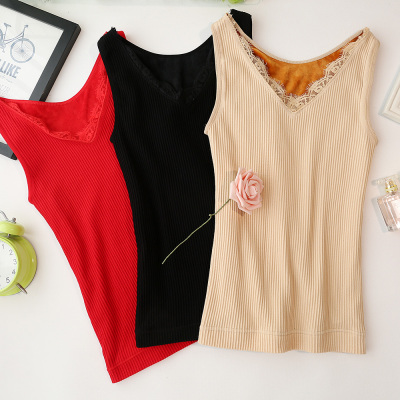 Mùa đông đồ lót nữ ren ren hoa cổ chữ V cộng với nhung dày vest sling nữ bó sát co giãn đáy áo thủy triều áo kiểu nữ đẹp 2021 Áo ba lỗ