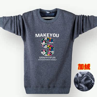 Mùa đông mới cộng với áo len nhung ấm áp Áo len nam cộng với phân bón XL cổ tròn áo thun rộng đầu áo khoác thể thao áo hoodie rộng