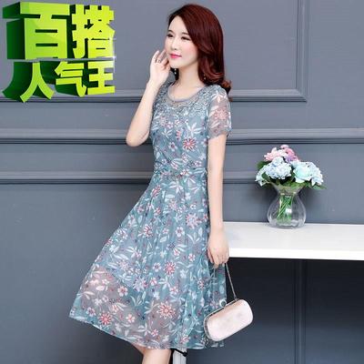 Mùa hè 2019 d mùa mới của phụ nữ trung niên đầm voan trong đoạn dài đến đầu gối tay ngắn hoa một chiếc váy chữ - A-Line Váy váy xòe xếp ly