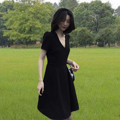 Mùa hè 2019 mới cổ chữ V ngắn tay dài đoạn cỡ lớn váy đen bút lớn một chữ Hepburn váy đen nhỏ quần áo nữ - A-Line Váy váy chữ a cho người béo A-Line Váy