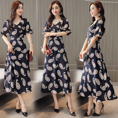 Mùa hè 2019 mới của phụ nữ Đầm cổ chữ V phiên bản Hàn Quốc của váy ngắn eo thon dài in họa tiết trong một đoạn váy dài - A-Line Váy vay xoe A-Line Váy