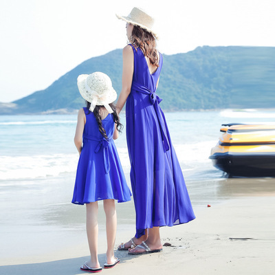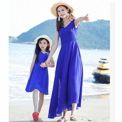 Mùa hè 2019 mới mẹ và con gái đi biển đi biển đi biển thời trang váy đỏ cổ chữ V cha mẹ-con gái váy công chúa - Trang phục dành cho cha mẹ và con váy trẻ em hàn quốc