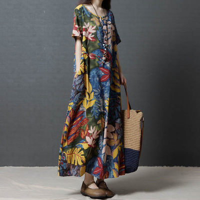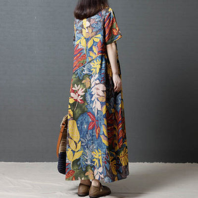 Mùa hè 2019 mới nghệ thuật retro gió quốc gia phụ nữ lỏng lẻo in kích thước lớn váy dài tay cotton ngắn và váy lanh áo dạ nữ đẹp 2020