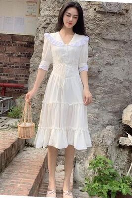 Mùa hè 2019 mới retro ren bên váy dài eo eo cổ áo búp bê tay áo ngắn Một chiếc váy nữ - A-Line Váy thời trang nữ cao cấp