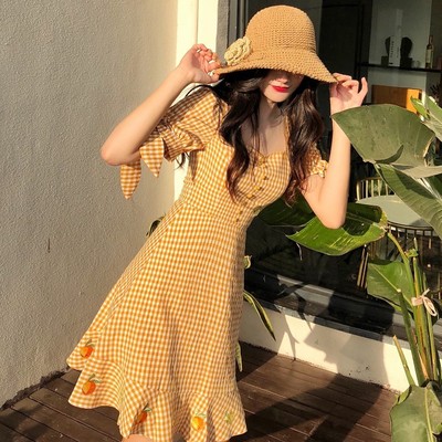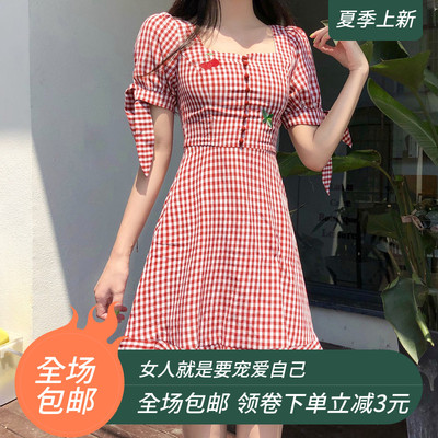 Mùa hè 2019 mới thêu cổ áo vuông Một chiếc váy ngắn Váy ngắn tay kẻ sọc Váy xòe - A-Line Váy mẫu đầm chữ a