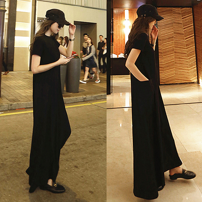Mùa hè 2019 phiên bản mới của Hàn Quốc với kích thước lớn của phụ nữ váy dài modal đứng cổ áo ngắn tay Một chiếc váy chữ - Váy dài dam maxi di bien Váy dài