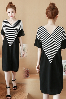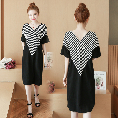 Mùa hè chất béo mm lớn kích thước của phụ nữ ngắn tay v- cổ t- shirt bao gồm áo sơ mi bụng trong phần dài phiên bản lớn của sọc đầm 200 kg áo dạ nữ dáng dài hàn quốc