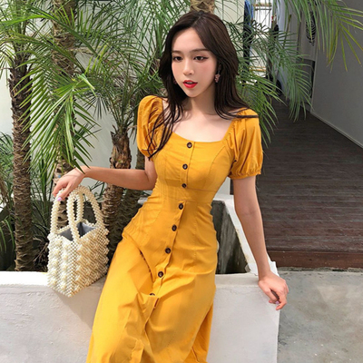 Mùa hè Hàn Quốc phiên bản của chic retro slim cao eo là mỏng màu rắn đơn ngực vuông cổ áo ngắn tay dài ăn mặc nữ váy nhún phần eo Váy eo cao