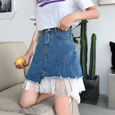 Mùa hè Hàn Quốc phụ nữ mới mỏng khâu ren bên váy chia ngã ba đính cườm cao eo váy denim chân váy hoa dài