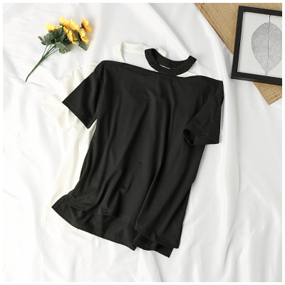 Mùa hè mới của phụ nữ Hàn Quốc phiên bản của màu rắn đơn giản và thoải mái trên cơ thể từ cổ áo treo cổ hoang dã đầu T-Shirt GY áo thun form rộng nữ Áo phông