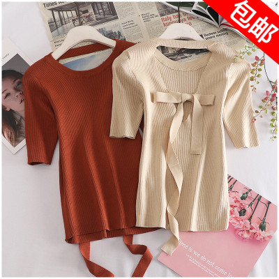 Mùa hè mới Slim giảm béo trở lại màu rắn ngắn tay áo thun áo len phụ nữ 25430 áo len dáng dài Áo / áo thun