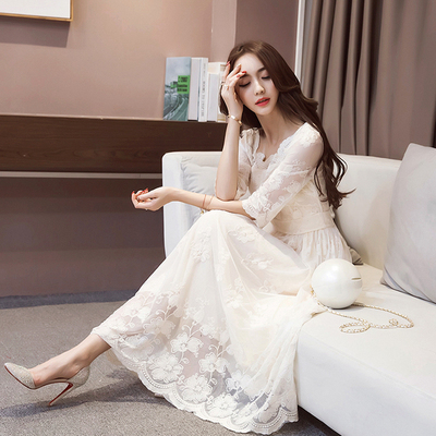 Mùa hè phụ nữ châu Âu và Mỹ tính khí là đầm ren mỏng ôm giữa chiều dài đáy váy cổ tích rỗng đầm đầm sơ mi trắng thắt eo