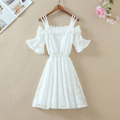Mùa hè trắng eo thon thon một từ váy dài một đoạn vai dưới dây đeo váy ren - A-Line Váy váy suông chữ a A-Line Váy