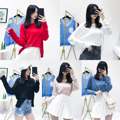 Mùa thu Hàn Quốc phiên bản của chic loose mỏng vòng cổ áo thun màu rắn giản dị hoang dã áo len dài tay T-Shirt phụ nữ áo cardigan nữ hàn quốc Vòng cổ áo len