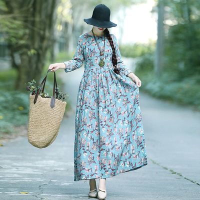 Mùa thu mới phong cách quốc gia của phụ nữ retro Sen nữ nghệ thuật in rộng kích thước lớn tay dài cotton và váy lanh váy dài váy lụa dáng dài Váy dài