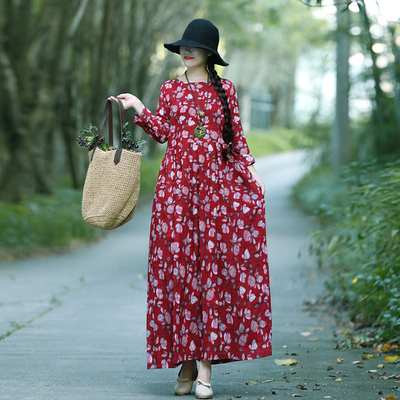 Mùa thu mới phong cách quốc gia của phụ nữ retro Sen nữ nghệ thuật in rộng kích thước lớn tay dài cotton và váy lanh váy dài váy lụa dáng dài