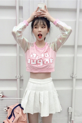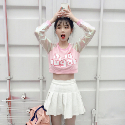 Mùa xuân 2018 mới nữ dài- tay mềm chị nhỏ tươi đầy màu sắc lưới cao eo áo thun hoang dã thư ngắn áo len bộ vest nữ
