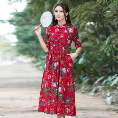 Mùa xuân 2018 phong cách dân tộc retro mới là cotton mỏng và tay áo cổ áo cổ áo khóa bút lớn một chiếc váy dài mẫu váy xòe liền thân đẹp