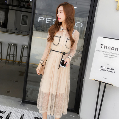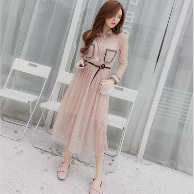 Mùa xuân 2019 phiên bản Hàn Quốc mới của phần dài của cổ áo sơ mi thắt eo ren phụ nữ chạm đáy một chiếc váy lớn - A-Line Váy váy chữ a đẹp