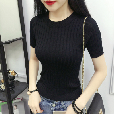 Mùa xuân và mùa hè mới của Hàn Quốc phiên bản của vòng cổ màu rắn ngắn tay áo sơ mi của phụ nữ đáy áo pit dải mỏng của phụ nữ áo len áo len gile len Vòng cổ áo len