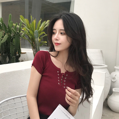 Mùa xuân và mùa hè phụ nữ mới của Hàn Quốc thời trang nửa mở cổ áo dây đeo chéo ngắn tay áo len áo thun chặt chẽ skinny áo sơ mi áo len croptop Áo / áo thun