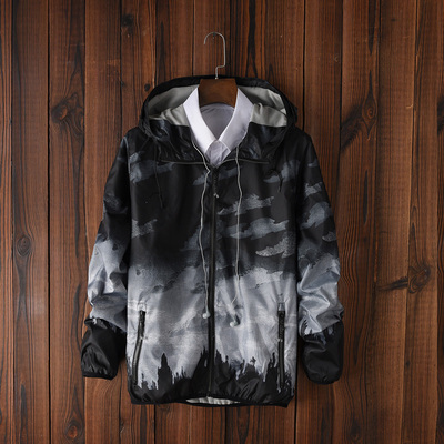 Mùa xuân và mùa thu mũ trùm đầu nam áo khoác gió Phiên bản Hàn Quốc của áo khoác ngụy trang tự canh tai nghe quần áo cộng với phân bón quần áo nam XL - Áo gió áo khoác gió Áo gió
