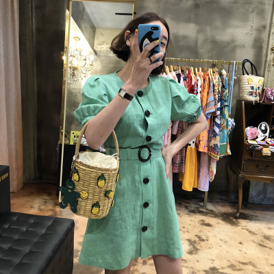 [Muzly] Hàn Quốc ins Ghost Horse Cô Gái Dễ Thương Lão Hóa Đơn ngực Vành Đai Thắt Lưng Ngắn Tay Áo Đầm váy hạ eo xếp ly