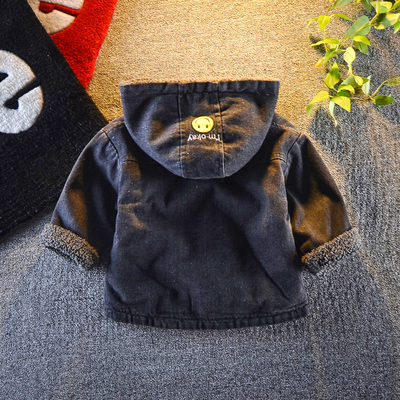 Nam bé váy thủy triều 0-1-3 tuổi 4 bé trai denim áo khoác mùa thu cộng với nhung dày trẻ em nam mùa đông trùm đầu quần áo áo khoác trẻ em hàn quốc Áo khoác