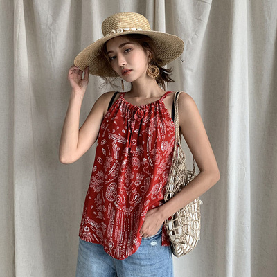 Người hâm mộ MO Hàn Quốc mua trang web chính thức trang phục mùa hè phụ nữ stylenanda phong cách dân tộc in áo yếm xếp li hàng đầu - Áo ba lỗ áo sơ mi nữ