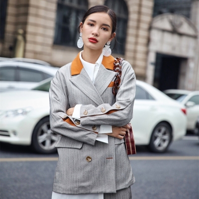 Original retro bất đối xứng pocket hit màu gió Anh phù hợp với áo khoác rộng quần chân yếm suit casual mùa thu mới vest kẻ nữ Business Suit