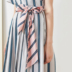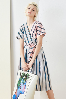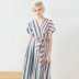 Oz nước pastel hồng xanh dệt sọc thoải mái cao cotton bọc V-cổ cao eo ren midi ăn mặc váy thắt eo