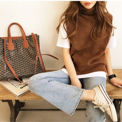 Phiên bản hàn quốc mùa thu đông đan áo len dày áo len cổ cao không tay áo vest vai áo vest ngắn áo khoác jean nữ