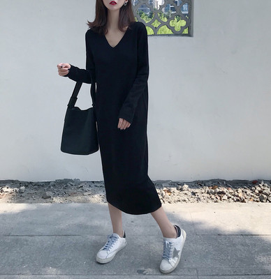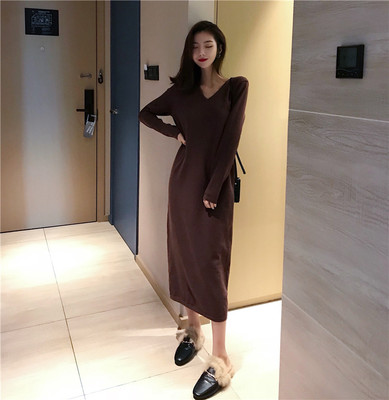 Phong cách retro đơn giản màu rắn dài váy đan nữ mùa thu và mùa đông mới V-cổ khí chất đáy váy lỏng lẻo quần áo nữ hàng hiệu