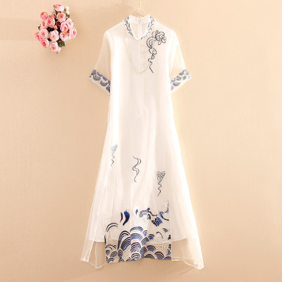 Phong cách trung quốc lụa organza dress 2018 mùa hè mới đứng cổ áo ngắn tay áo Xiangyun thêu lỏng Một từ váy nữ váy kẻ caro dáng chữ a