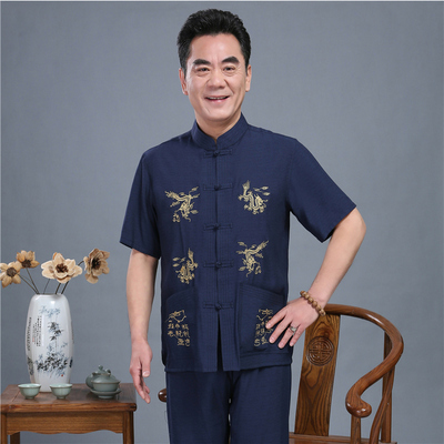 Phong cách Trung Quốc Tang phù hợp với nam mỏng phần trung niên vải lanh cha ngắn tay T áo cotton và vải lanh thêu quần áo mùa hè - Trang phục dân tộc những kiểu đồ bộ đẹp