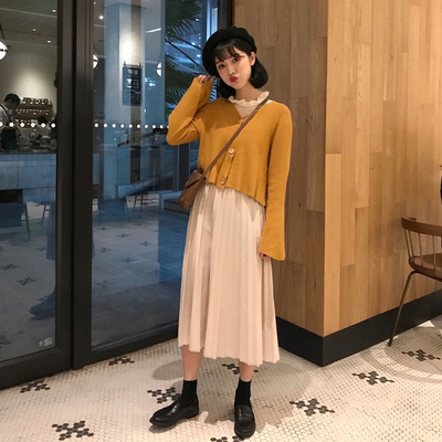 Phụ nữ mùa thu 2018 Hàn Quốc áo ren cổ cao chạm đáy + tay áo kèn đan áo len + váy thun eo sinh viên áo len nữ Cardigan