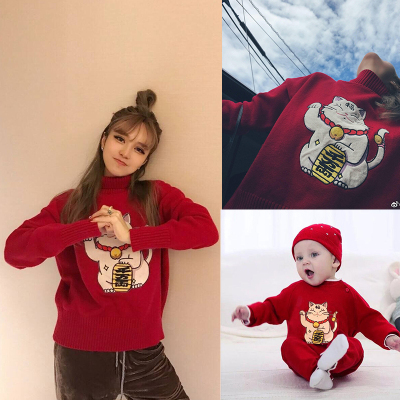Quần áo mùa đông cho cha mẹ và con 2018 hai mẹ con tải một gia đình ba chiếc áo len cổ cao cho bé romper gia đình quần áo màu đỏ năm mới váy trễ vai mẹ và bé Trang phục dành cho cha mẹ và con