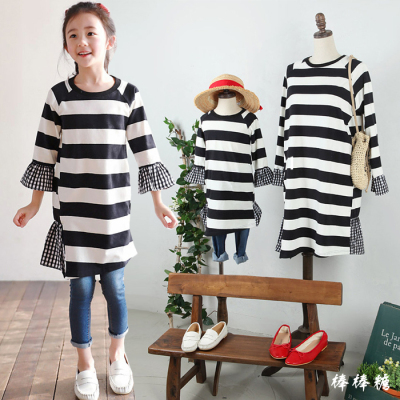 Quần áo mùa thu cha mẹ trẻ em 2018 mới phụ nữ mẹ phiên bản Hàn Quốc của bé gái mùa thu khâu váy len sọc bộ đồ thể thao đẹp cho cả nhà