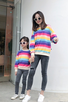 Quần áo mùa thu mới 2019 màu đỏ cha mẹ và trẻ em một gia đình ba phiên bản Hàn Quốc của áo len sọc cầu vồng lỏng lẻo mẹ và phụ nữ trẻ em - Trang phục dành cho cha mẹ và con đồ ngủ cho cả gia đình Trang phục dành cho cha mẹ và con