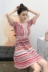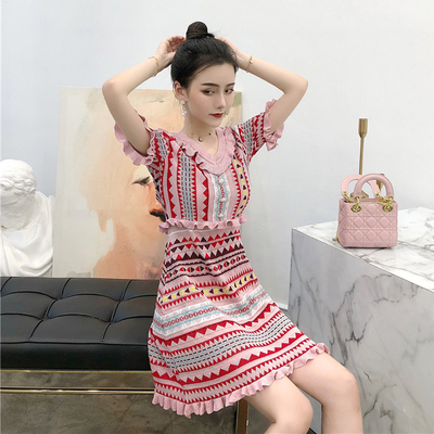 Retro chic eo hồng bằng gỗ tai V-Cổ ngắn tay đan váy dài Pháp nhỏ hương thơm ăn mặc váy suông thắt eo Váy eo cao