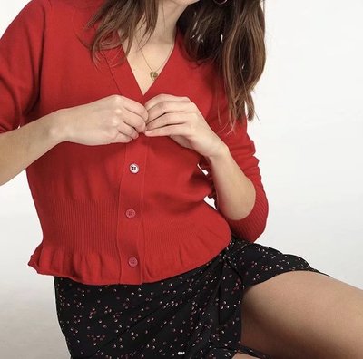 [] Rouje Pháp retro xù V-cổ khóa phần ngắn cao eo dài tay áo len 1801-17 áo khoác len nữ dày Cardigan
